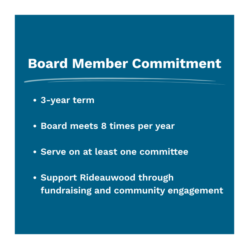 Board members serve an initial three-year term and participate in regular board and committee meetings throughout the year. In addition to governance responsibilities, board members support Rideauwood’s work through advocacy, community engagement, and participation in fundraising and organizational events.