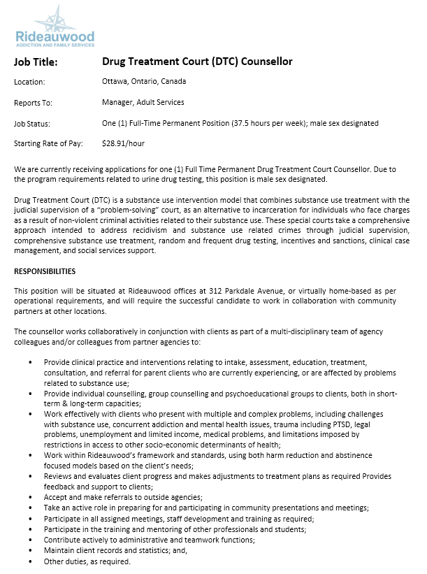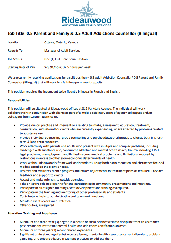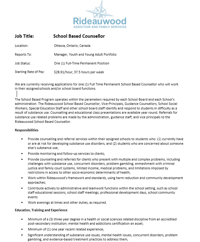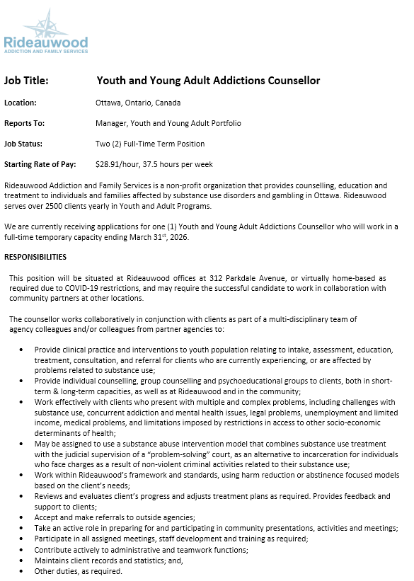 Rideauwood is a community leader and a connected and caring team of professionals who specialize in substance use, behavioural addictions and mental health issues. We focus on supporting our clients as they navigate their life circumstances and choose options that work best for them. If you believe you are a good fit for our unique culture and have skills that are an excellent match for one of the opportunities listed below, we welcome your application.